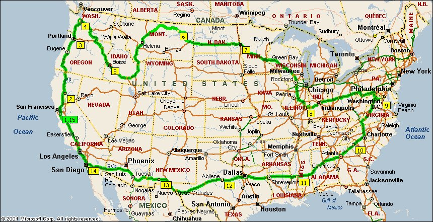 Driving Distance: 7687.6 miles Time: 13 days, 4 hours, 36 minutes